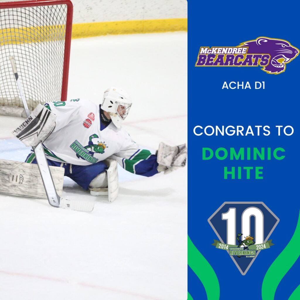 Former Riverkings goalie Dominic Hite has committed to play for McKendree University. Dominic was a late season trade acquired from the Hudson Havoc and was a beast in net with over 1300 saves during the 2024-25 season.